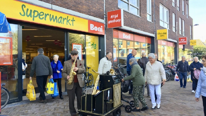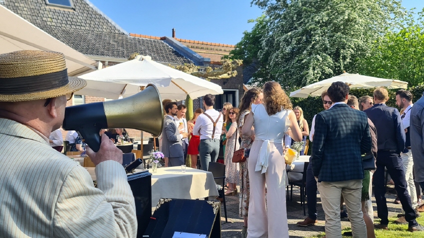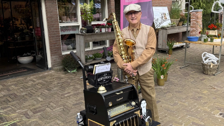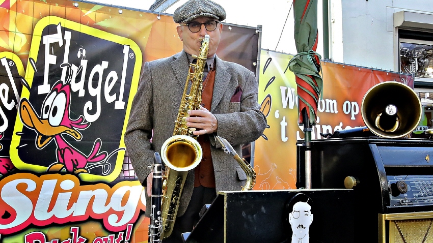 In de sfeer, kleding outfit en tijdsbeeld van de Roaring 20-ties (Roaring Twenties). Mobiele live muziek voor elke gelegenheid! Saxofoon, klarinet en zang daarbij een begeleiding van een volledige ritmesectie op mp3-speler,een volledig dixielandorkest